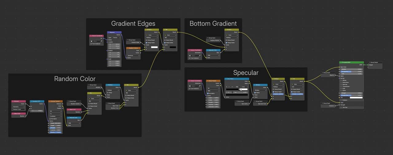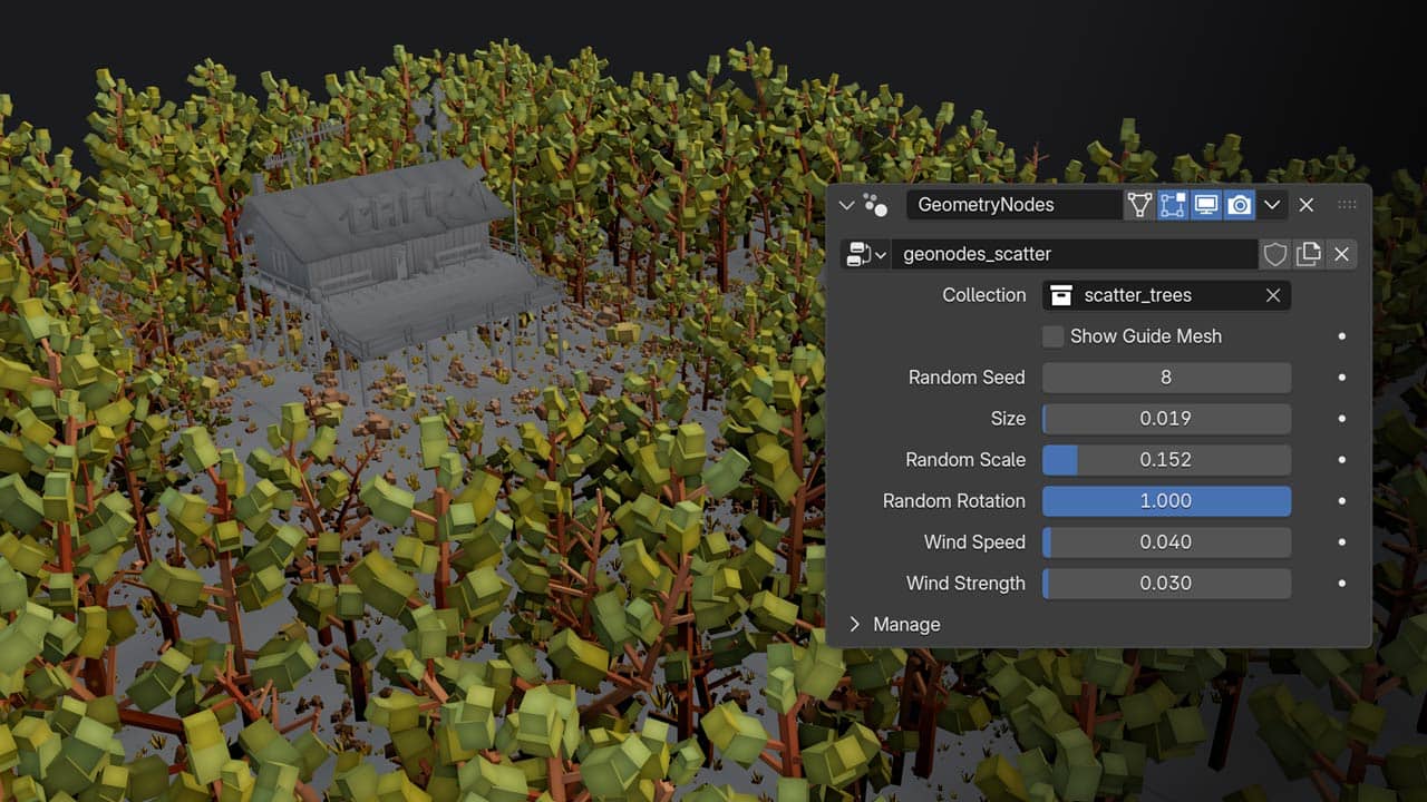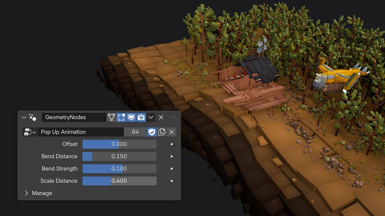 In the course, I break down the new shader, node by node so you can clearly understand and adapt it to your own projects. 4. Improved Pop-up Animation using Geometry Nodes This is one of the biggest improvements in the new update. Previously, the pop-up animation looked great, but required a lot of tricks and particles to sell the effect, and your scenes ended up with a lot of seperate objects that would clutter your Outliner. In the new system, the pop-up animation is based on Geometry Nodes, easy to use and very flexible. Now you can simply drag and drop the node group and preview everything in real time. Instead of needing to adjust keyframes, you have full control of speed, direction, wave effect and more. In the new chapter I fully explain how this setup works, so you can repurpose or customize it for your own ideas. 5. Improved Object Scattering I’ve also improved the scattering using GeoNodes, letting you easily populate scenes. You can even select individual assets and adjust them freely. This makes filling your environments with lots of assets and details very easy, while still allowing you to go in and tweak them individually. It also works great with the new pop-up animation. There’s also a built-in wind effect to add subtle motion and life to your worlds. About the Cubic Worlds course as a whole The style is intentionally flexible, letting you decide how simple or complex your scenes become. In the full course, I guide you step by step through: